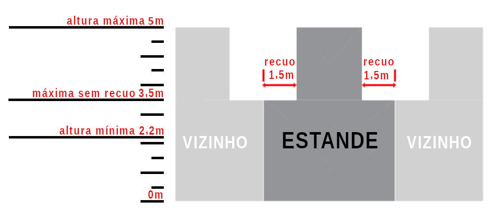 Estandes com altura superior a 3,5m a partir do piso do pavilhão deverão estar recuados do estande vizinho conforme o diagrama abaixo: