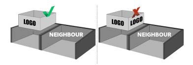 Não é permitida a aplicação de comunicação visual (logotipo, imagem, grafismo e etc.) voltado para os estandes vizinhos quando geminados. É permitido explorar apenas as fachadas de acordo com a configuração da área locada, não importando o ângulo de instalação ou a distância do recuo.